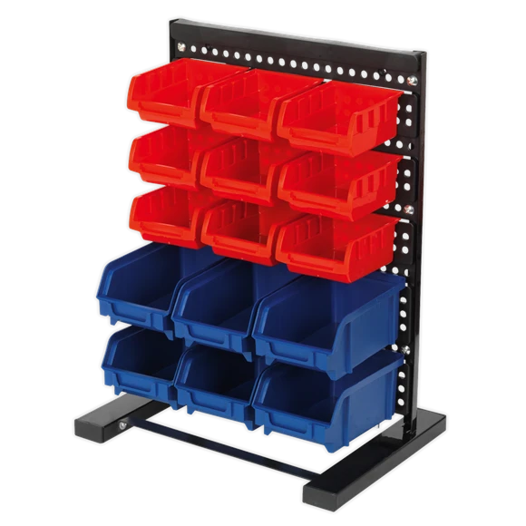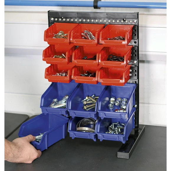 Workbench or countertop parts storage system. Suitable for storing nuts, bolts, screws or any small components. Helps to keep work area tidy and parts to hand. Fifteen storage bins mounted onto a composite back panel.