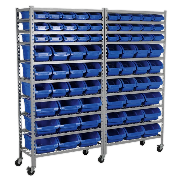 Powder coated steel rack with seventy-two robust composite storage bins evenly spread across eighteen shelves. Mounted on heavy-duty castors (two lockable) for mobility. Unit can hold up to a maximum weight of 200kg evenly spread across the bins. Optional fixing kit available allowing multiple units to be joined together – order Model No. TPSJK.