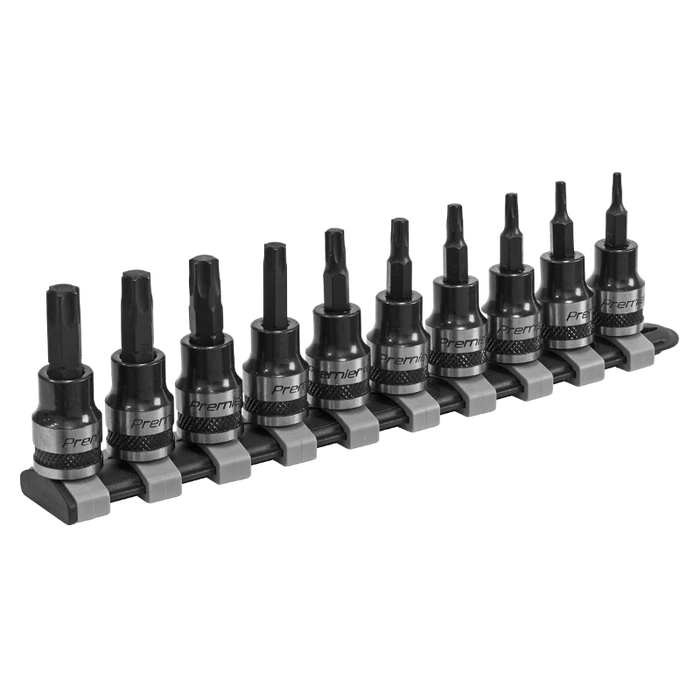 Professional heat treated Chrome Vanadium steel sockets. Fully polished black chrome finish with machined and lacquered surfaces. S2 Steel TRX-Star* bits with a phosphate finish. Knurled ring to assist gripping with oily fingers. Supplied on socket rail.