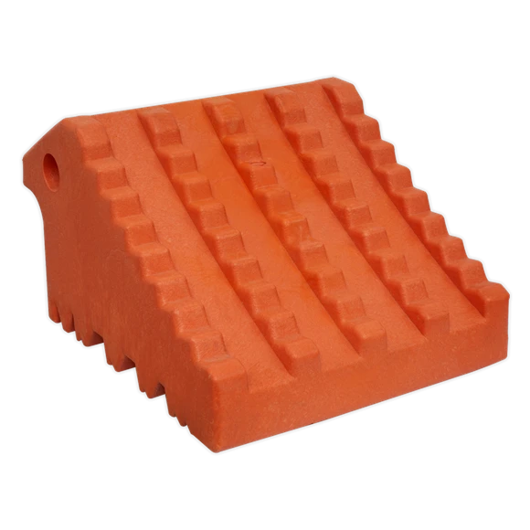 Prevents vehicle movement when being jacked on a level surface or parked on an incline not exceeding 12 degrees. Suitable for chocking car, aircraft or light commercial vehicles. Moulded carry handle for convenience, as well as two Ø22mm holes for a rope or chain (not included)