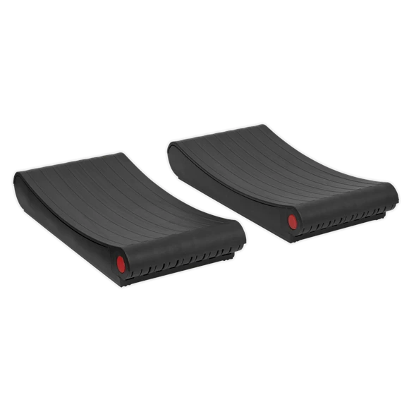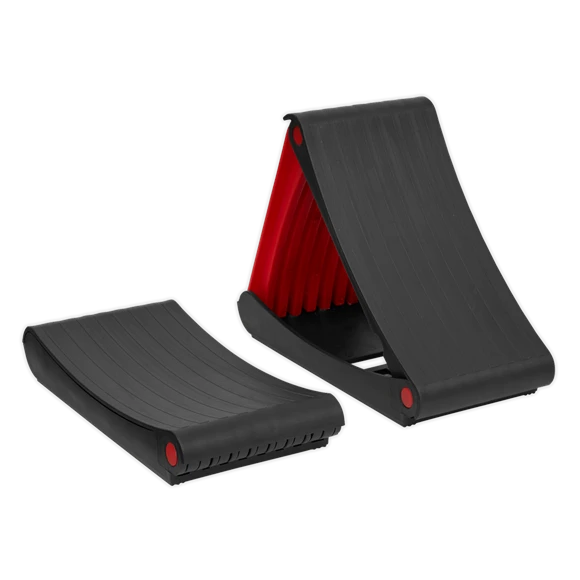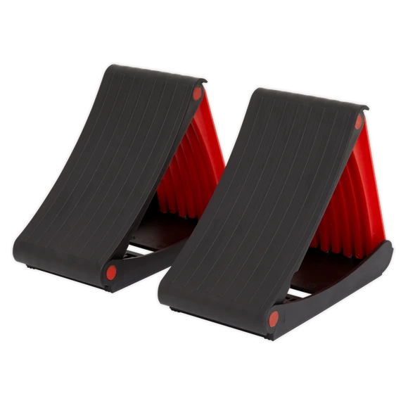 Compact automotive wheel chocks for use during emergency wheel change. To be used on a flat surface only. Fold flat for easy storage in glove box or door pocket.